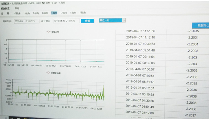 直川科技無線傾角傳感器在杭州文一路隧道監(jiān)測隧道曲率的變化,每200米設(shè)置一個斷面監(jiān)測點(diǎn),每個斷面有8個傾角傳感器監(jiān)測點(diǎn)進(jìn)行監(jiān)測,隧道上層分布3個傾角傳感器,隧道下層分布5個傾角傳感器,總共88只無線傾角傳感器一起(其升級版產(chǎn)品型號為網(wǎng)關(guān)ZCT800ML-GW和傾角傳感器ZCT800ML-215SR)監(jiān)測隧道的縱斷面縱向曲率變化。LORA無線傾角傳感器具有誤差小,24小時連續(xù)監(jiān)測,低功耗,惡劣環(huán)境仍能保持穩(wěn)定等優(yōu)勢。與其它環(huán)境類傳感器如靜力水準(zhǔn)儀、測縫儀、隧道收斂計(jì)等一起使用,利用分布監(jiān)測點(diǎn)的方式使信息的準(zhǔn)確性和及時性得到保障。由圖中的數(shù)據(jù)可以顯示,該數(shù)據(jù)能夠準(zhǔn)確反映出隧道縱斷面的變形趨勢,得到高精度的角度變化量。 自動化監(jiān)測通過各種傳感器、網(wǎng)絡(luò)和數(shù)據(jù)對公路隧道情況進(jìn)行實(shí)時監(jiān)測,不僅節(jié)約了工作人員的工作時間,還提高了隧道故障檢測效率。自動化監(jiān)測技術(shù)能夠?qū)λ淼狼闆r通過數(shù)據(jù)實(shí)現(xiàn)可視化,可以細(xì)節(jié)性得展示出人工檢測所不易發(fā)現(xiàn)的安全隱患,及時作出安全評價(jià)及安全預(yù)警。這為有效降低意外安全事故的發(fā)生,為地鐵安全運(yùn)行提供了數(shù)據(jù)保障。